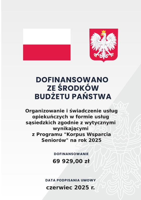 „Korpus Wsparcia Seniorów" na rok 2025 to program wsparcia skierowany do gmin w celu zapewnienia seniorom (60+) usług opiekuńczych, w tym w formie usług sąsiedzkich i "opieki na odległość". Program ma na celu poprawę bezpieczeństwa i samodzielności seniorów w miejscu zamieszkania. Program zakłada wsparcie finansowe gmin w zakresie organizowania usług opiekuńczych w formie usług sąsiedzkich. Obejmuje pomoc w zaspokajaniu podstawowych potrzeb życiowych, podstawową opiekę higieniczno-pielęgnacyjną i kontakty z otoczeniem.